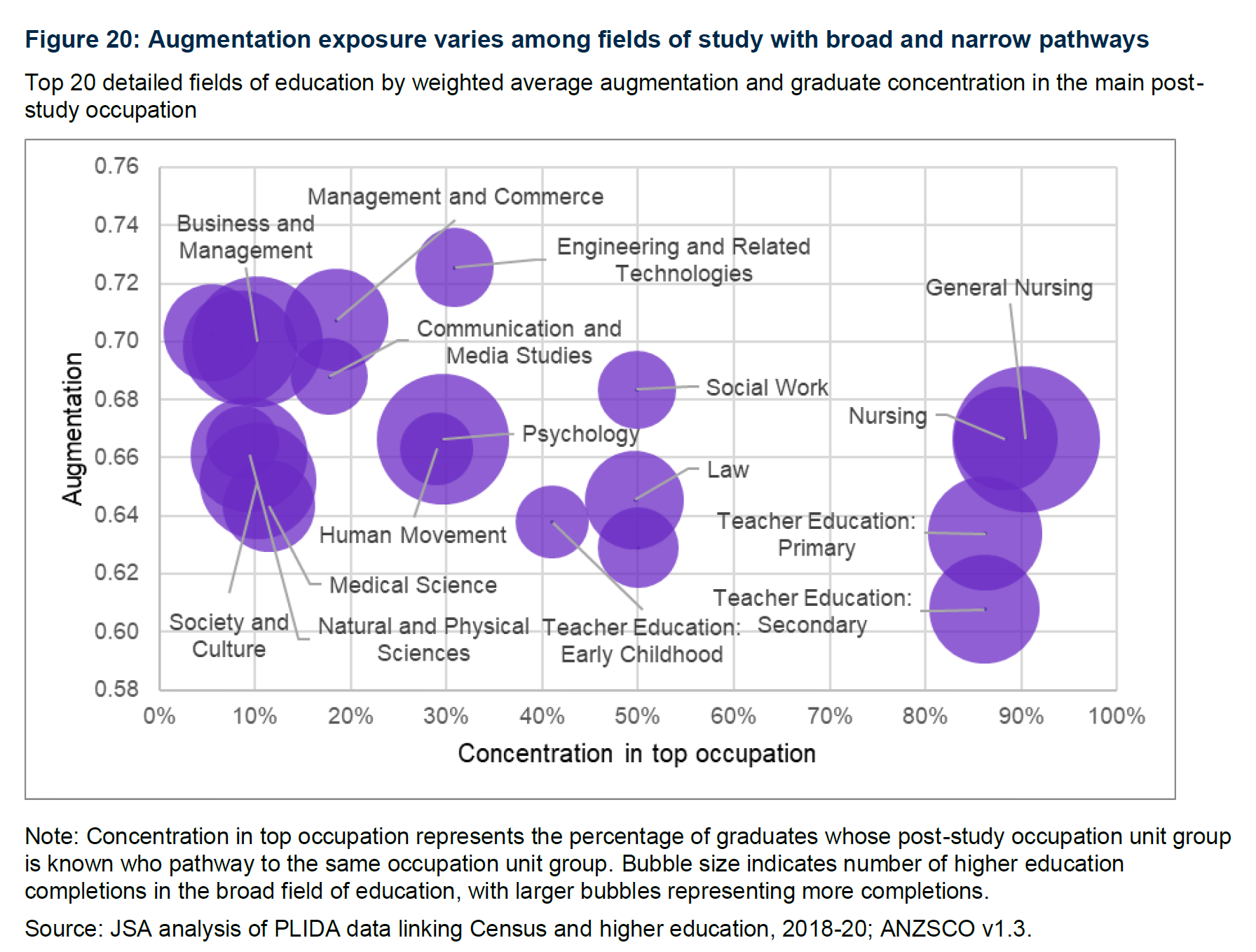 This means our students won’t be competing against AI; they’ll be expected to work with it. The technology will handle routine elements of their work, freeing them up to focus on tasks requiring deep expertise, creativity, and human judgment. This is especially true for higher-skilled, knowledge-based professions. The report shows that occupations at the highest skill levels (ANZSCO skill levels 1 and 2) have the greatest propensity to be augmented by Gen AI, transforming fields from engineering to education.