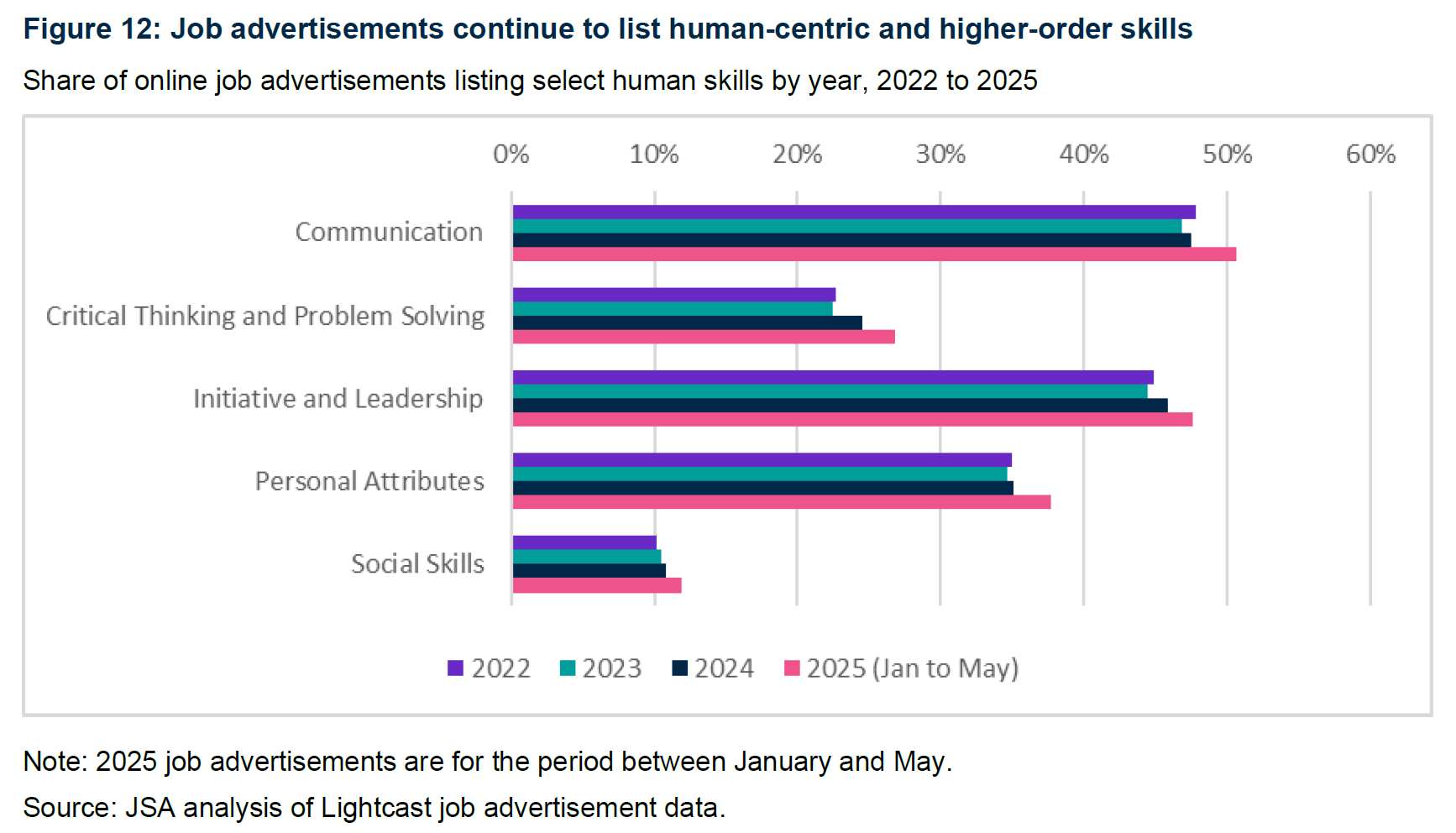 - Communication & Interpersonal Skills: Technology can generate a report, but it can’t build trust with a client, empathise with a patient, or collaborate effectively with a diverse team. As one stakeholder from the retail sector noted, “interpersonal skills such as empathy, problem-solving and communication will become increasingly valuable as they complement AI capabilities”.